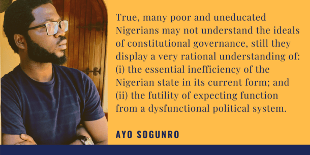 The idea that many Nigerians are disinterested in the Nigerian state is hard to process by our educated middle class. But anyone who has consistently dealt with the Nigerian state from a position of powerlessness quickly understands the personal implications of dysfunction. Inequality becomes a daily systemic experience that cannot be dismissed simply by the promises of partisan politics.