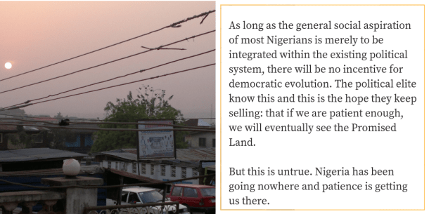 But as long as the general social aspiration of most Nigerians is merely to be integrated within the existing political system – or as we say, ‘to make it’ – then there will be no incentive for democratic evolution. The political elite know this, and this is the hope they keep selling: the hope that if we are patient enough, we will eventually see the Promised Land. But this is untrue. Nigeria has been going nowhere and patience is getting us there.