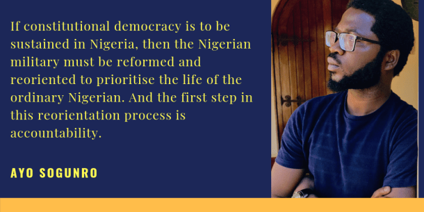 Today, only those who want to bury their heads in sand will believe that the Nigerian military cares about protecting Nigerian lives. Instead, the military concerns itself only with protecting state security – personified in the president and his supporters – at the expense of ordinary Nigerian lives. But we must not allow this abnormality to continue. It is abominable that the supposed defenders of our lives are the ones most likely to take it. If constitutional democracy is to be sustained in Nigeria, then the Nigerian military must be reformed and reoriented to prioritise the life of the ordinary Nigerian. And the first step in this reorientation process is accountability. If we are to progress, we must ensure that those who commit atrocities must be confronted by justice – either under domestic or international law.