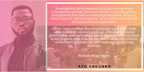 Incompetent governments in Africa have always misused the phrase ‘African culture’ to justify actions and policies that add no value to governance. Even so, their ideas of ‘African culture’ have little to do with the African cultural experience. Often, they conflate the very real and continent-wide syncretism of colonial ideology, Abrahamic moral philosophy, and surviving aspects of traditional societies in our present-day with the existence of an identifiable, monolithic, prehistoric, and unchanging ‘African culture’. No such thing exists. If the Director-General had paused to discuss with historians and other academics, he would have understood the nuances: that there are several, diverse, and even conflicting, African cultures across time and space – and all have been significantly impacted by colonial culture.